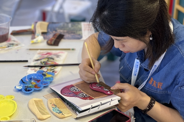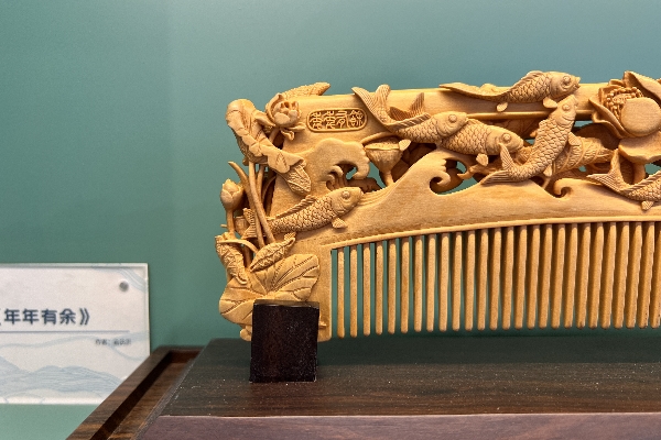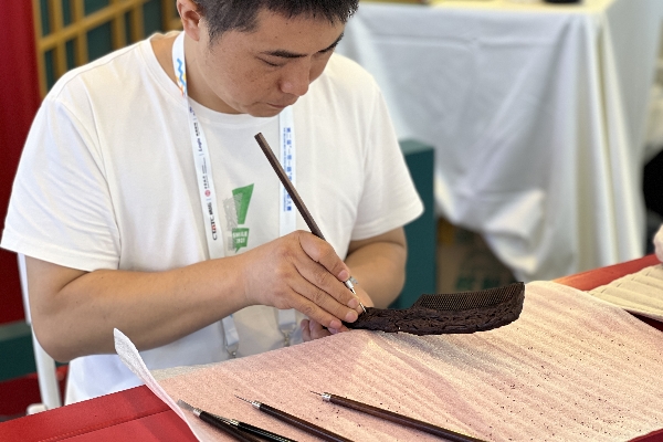 除了靜態(tài)展陳以外,活態(tài)展演也同步進行。重慶市工藝美術大師、第一屆中國工美行業(yè)藝術大師俞達洪現場展示了浮雕、鏤空雕等技藝,讓重慶市市級非物質文化遺產項目“譚木匠木梳制作技藝”以更生動、直觀的方式展現在各國友人面前。